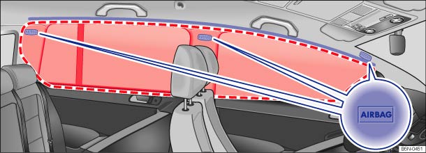 Abb. 76 Auf der linken Fahrzeugseite: Einbauort und Entfaltungsbereich des Kopfairbags.