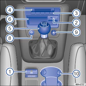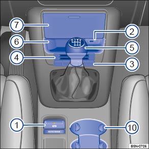Abb. 8 Fahrzeuge ohne Keyless Access: Übersicht des unteren Teils der Mittelkonsole.