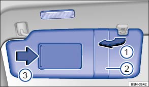 In der heruntergeklappten Sonnenblende kann sich hinter einer Abdeckung ein Make-up-Spiegel befinden. Beim Aufschieben der Abdeckung ⇒ Abb. 86③ leuchtet eine Leuchte über der Sonnenblende auf.