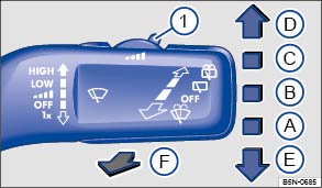 Intervallwischen für die Frontscheibe. Mit Schalter ⇒ Abb. 88① Intervallstufen (Fahrzeuge ohne Regen-Lichtsensor) oder Empfindlichkeit des Regen-Lichtsensors einstellen. |