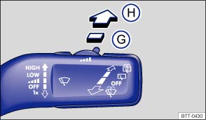 Bei gezogenem Hebel: Wisch-Wasch-Automatik zum Reinigen der Frontscheibe und Wasch-Automatik zum Reinigen der Frontscheinwerfer, wenn das Abblendlicht eingeschaltet ist. |