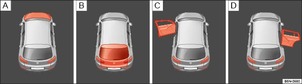 Abb. 13 Im Display des Kombi-Instruments: Zustandsanzeigen der Motorraumklappe, der Gepäckraumklappe und der Türen.
