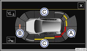 Wenn die seitlichen Bereiche Ⓒ nicht in der Bildschirmanzeige des Radio- bzw. Navigationssystems dargestellt werden, werden keine Signaltöne für diese Bereiche ausgegeben.