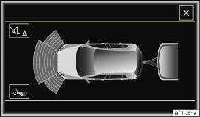 Im Anhängerbetrieb werden die Segmente und Signaltöne nicht mehr in Abhängigkeit vom Lenkeinschlag dargestellt bzw. ausgegeben und die Fahrweganzeige wird ausgeblendet ⇒ Fahrweganzeige .