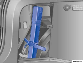 Gepäckraumklappe und linkes Ablagefach im Gepäckraum öffnen. Spanngurt öffnen und Warndreieck ⇒ Abb. 217 entnehmen.