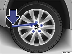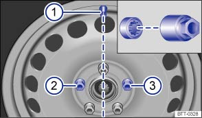 Abb. 233 Radwechsel: Reifenventil â‘ und Einbauorte der Anti-Diebstahl-Radschraube â‘¡ oder â‘¢.