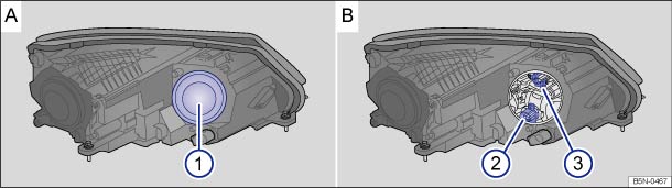 Die Abbildung zeigt den linken Scheinwerfer von hinten. Der rechte Scheinwerfer ist spiegelbildlich aufgebaut.
