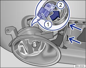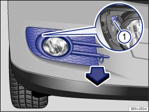 | 10. | Scheinwerfer von außen in die Aussparungen ⇒ Abb. 245 (Pfeile) einschieben und in den Stoßfänger einsetzen. |