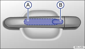 Abb. 30 Schlüsselloses Schließ- und Startsystem Keyless Access: Sensorfläche Ⓐ zum Entriegeln an der Innenseite des Türgriffs und Sensorfläche Ⓑ zum Verriegeln an der Außenseite des Türgriffs.