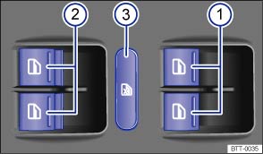 Sicherheitstaste ⇒ Abb. 37③ deaktiviert die Fensterhebertasten in den hinteren Türen. Dabei leuchtet die gelbe Kontrollleuchte in der Taste. |