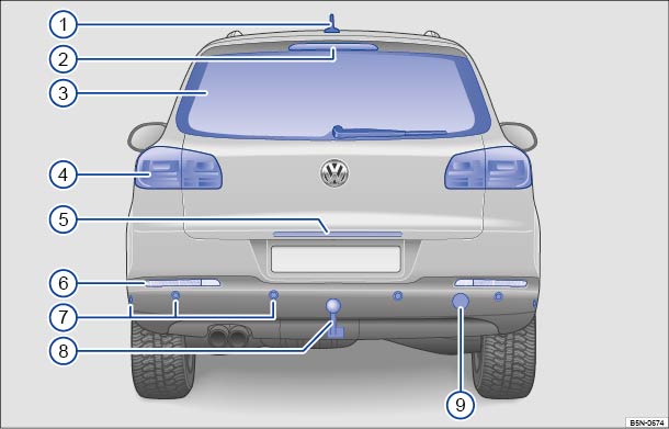 hinteren Abschleppöse hinter einer Abdeckung ⇒ An- und Abschleppen Die Positionen ④, ⑥ und ⑦ sind an der gleichen Stelle links und rechts vorhanden.