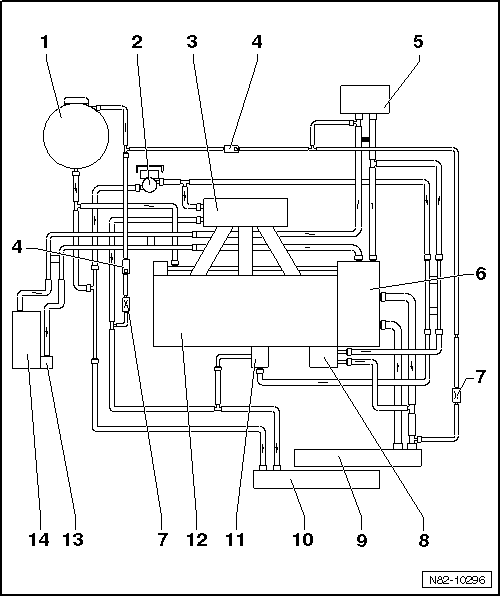 Der Aus- und Einbau der Stand-/Zusatzheizung und der Umwälzpumpe -V55- ist in diesem Reparaturleitfaden so beschrieben, dass nur wenig Luft in den Kühlmittelkreislauf gelangt bzw. verbleibt. Deshalb ist es nicht notwendig, nach dem Aus- und Einbau der Stand-/Zusatzheizung oder der -V55- den Kühlmittelkreislauf komplett zu entlüften.Sollte aber wegen einer anderen Beanstandung, z. B. wegen eines undichten Schlauchs oder nach dem Ersetzen von Kühlmittelrohren eine größere Menge Kühlmittel ausgetreten sein, ist der Kühlmittelkreislauf zu entlüften.